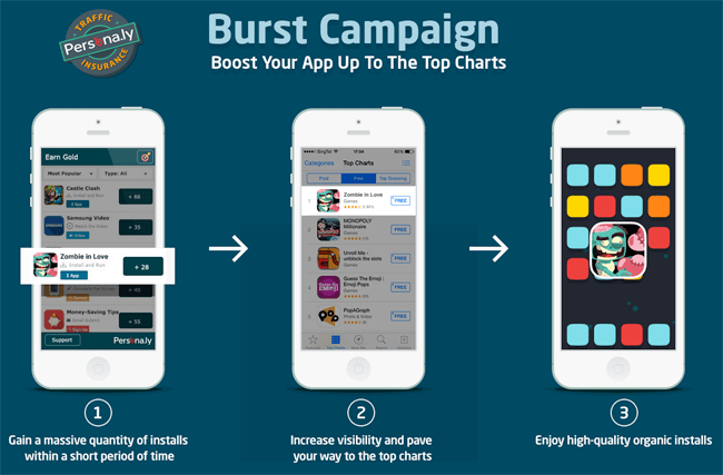 “Burst campaign” is a unique technique to stand out in a saturated market. The goal – reach the top of the top charts as quickly as possible. The process is built on getting as many installs as you can during the burst period, which usually lasts between 48 to 72 hours – the majority of them will be incentivized installs (When the user is not genuinely interested in your app but gets some sort of reward / virtual goods for downloading and using it).