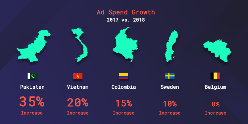 Appnexus compared digital ad spend growth (between 2017 to 2018) in countries that saw the biggest growth, and “our” countries’ results were as follows: Vietnam grew by more than 20%, Colombia grew by a bit over 15%, Sweden saw a rise of more than 10% while Belgium saw a rise of less than 10%. Pakistan, a country that wasn’t on our list, showed the biggest digital ad spend growth with more than a 35% increase.