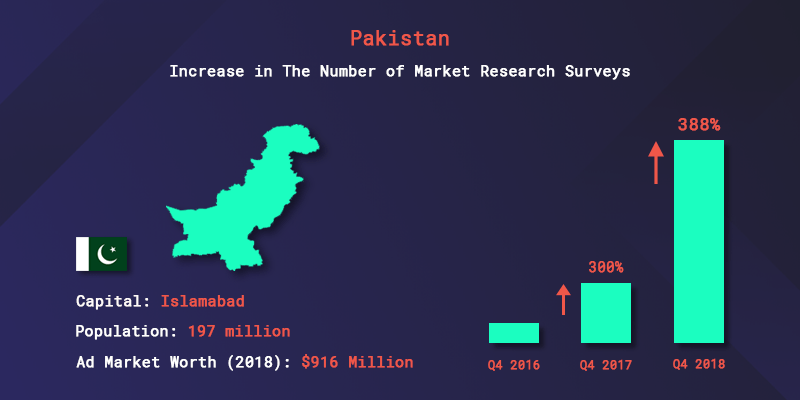 Between Q4 2017 and Q4 2018, there was an increase of 388% in the number of surveys offered to Pakistani consumers, which means that from 2016 to 2018 there was an increase of more than 1000% and that Pakistan is probably on its way to see more digital ad spend growth next year.