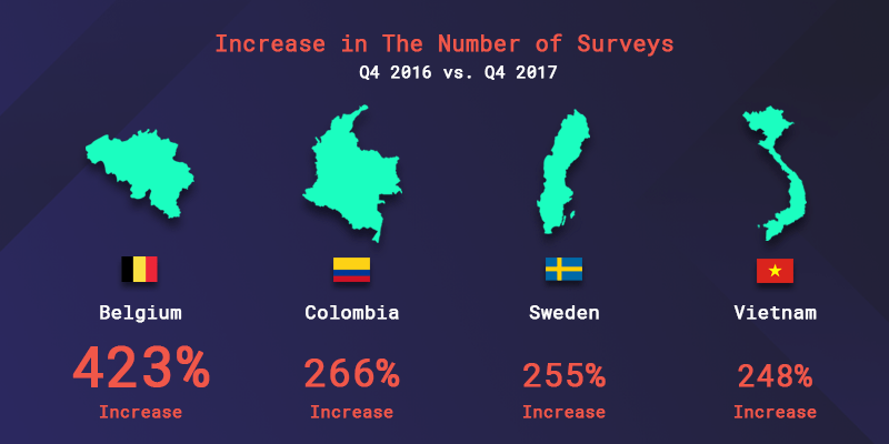 Last year we compared the number of surveys we’ve helped conduct in Q4 2016 to the number in Q4 2017 in all of the countries we serve surveys to consumers in and found the 4 countries that showed the biggest increase in surveys: