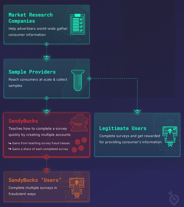Essentially the fraud is similar to what’s known in the mobile industry as “click farms”. “Sandybucks’” owner offers surveys fraud training and the graduates end up with their own survey farm – opening multiple accounts of a single survey and passing it by repeating answers that they know will get them through the survey. It can be in different languages, in any geo, and for any age – he teaches the “full package” of everything needed to cheat in order to pass the survey.