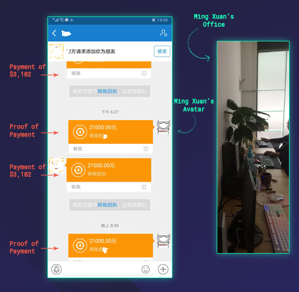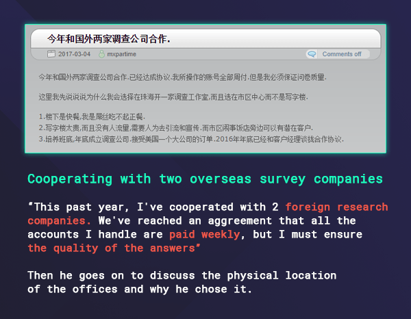 This QQ chat between him and a client was posted on his website, showing how he’s constantly getting paid, to prove that he can be trusted. The office’s picture enables us to glimpse into his survey farm.