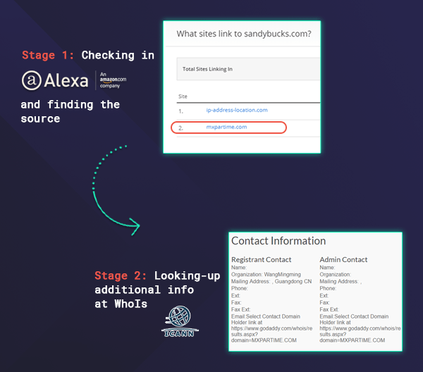 Our next move was to track where SandyBuck’s traffic really came from. We started by checking Sandybucks’s domain at websites such as Similarweb and Alexa. Similarweb didn’t find any evidence that the website even existed, while Alexa was able to get us our first lead from the “What sites link to” section, which is where we found mxpartime.