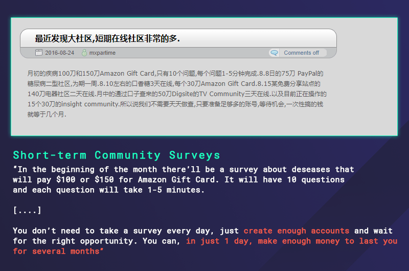 Notice how he explains, at the end of the post, that you don’t need to take surveys every day, and you can just open multiple accounts and make all the money you need in 1 day.