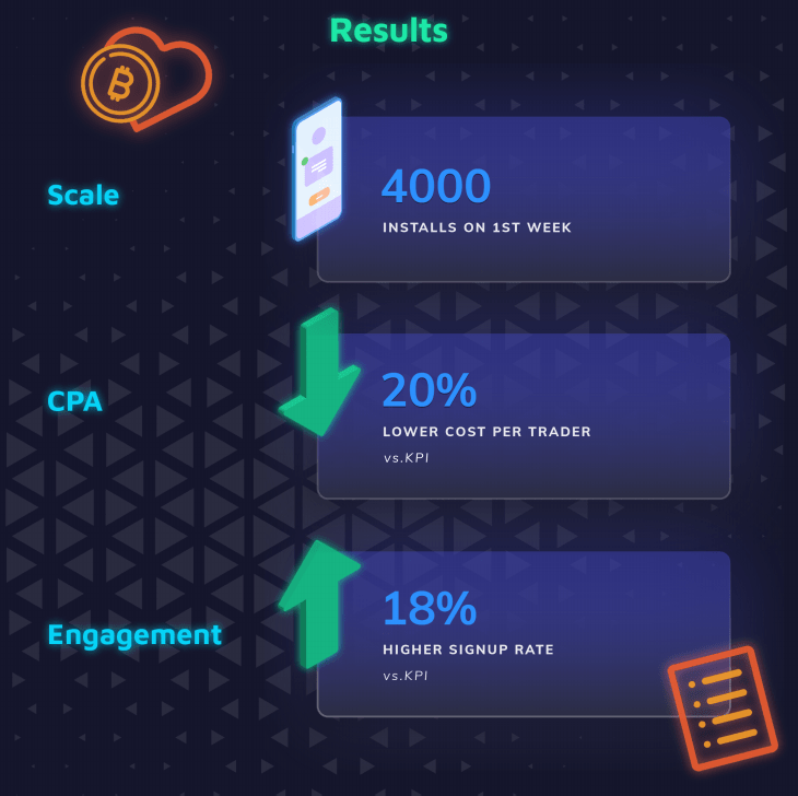 Within only two days of running the campaign, and with over 800 installs, modeling towards users that created portfolios began, which resulted in increasing the conversion rate from install to portfolio creation by 200%, and to exceed all performance KPIs within the first week of campaigns running.