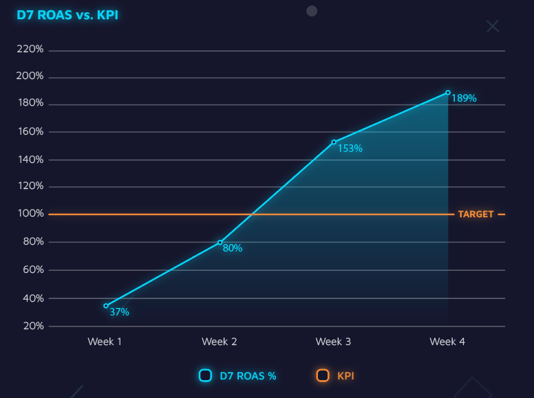 By week 3 of running the campaigns, our D7 ROAS was already 50% higher than the KPI, and on week 4, it was close to 90% higher.