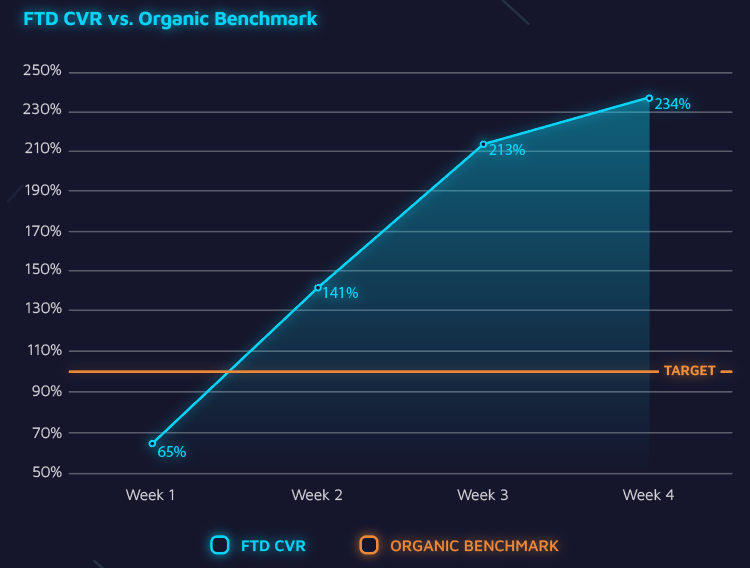 By the second week of running the campaign, our FTD CVR (i.e. payer conversion rate) was already significantly higher than the organic benchmark, and by week 3, it was 100% higher.