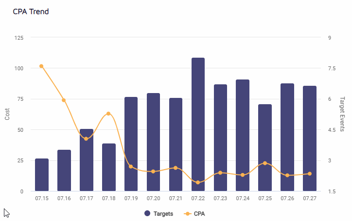 The CPA trend graph allows our partners to view their CPA in daily cohorts, for any target that they define, whether it’s an FTD, a trial registration, or completing an in-game tutorial.