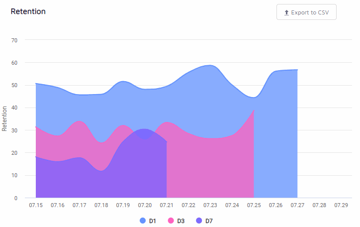 The graph includes D1, D3, and D7 retention and doesn’t include the more later D14/D30 to avoid visual overcrowding, but those are of course still available in our ‘Deliverables’ tab.