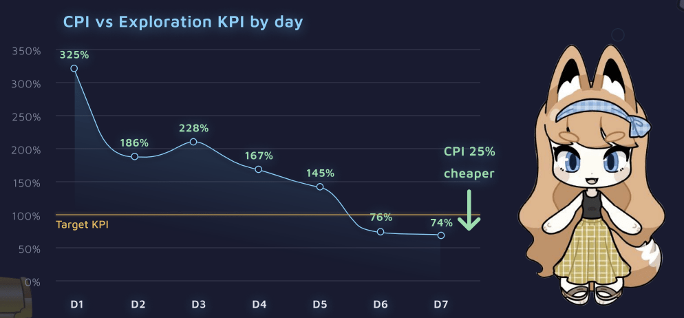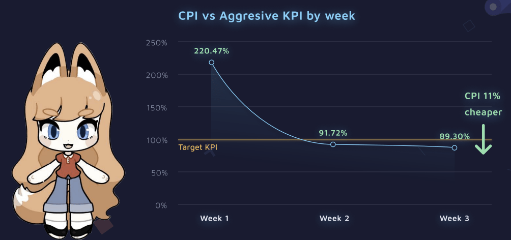 Two different CPI KPIs were provided – one more lenient for the initial exploration period of campaigns, and another, more aggressive, for when enough data was accumulated to run campaigns normally.