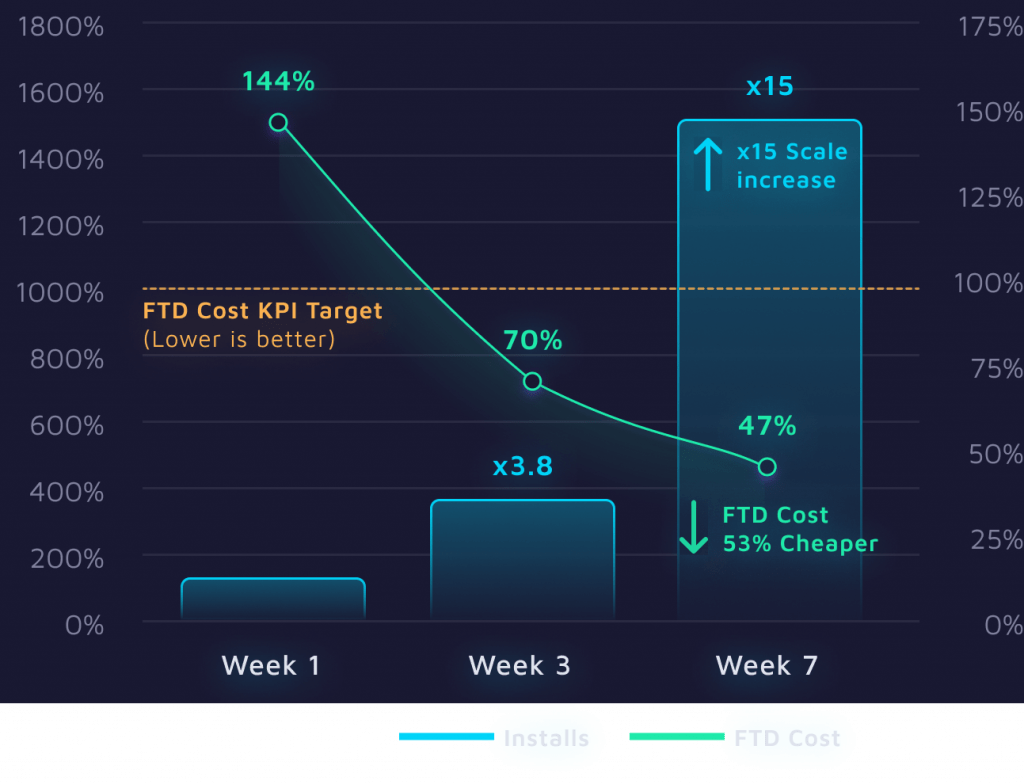 Within 3 weeks of starting the campaign, we were able to increase install volume by close to 400%, while already beating the KPI and generating an FTD cost of 30% cheaper than required.