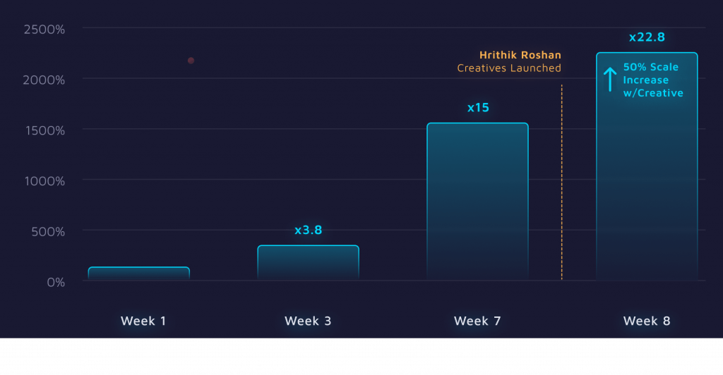 The addition of video advertisements starring Indian Actor Hrithik Roshan allowed for a massive additional increase of 50% in scale within a week of starting to use them at the very end of the seventh week of campaigns.
