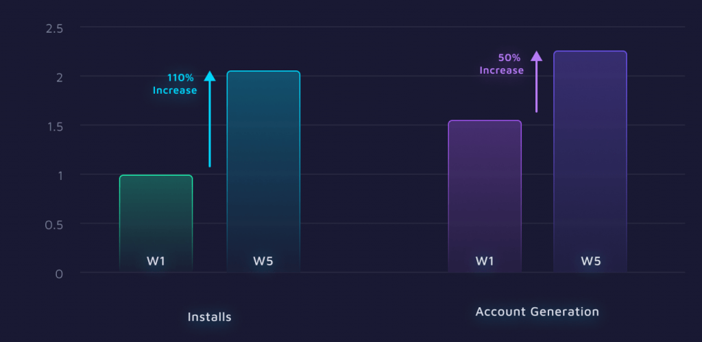 Within a month of starting campaigns, the install volume per week increased x2, all the while conversion rates towards the initially targeted funnel event of Account Generation improved by 50%.