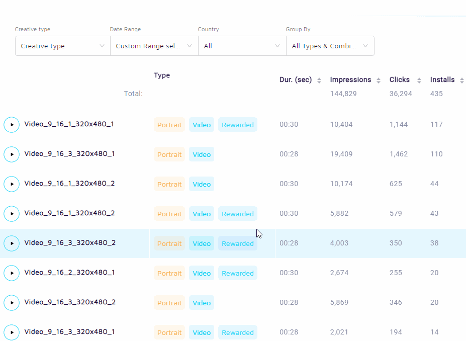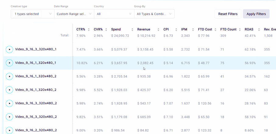 Under the “Creatives” section you will find all the information about your creatives’ performance: Clicks, Installs, CTR, CVR, and, in fact, most of the deep-funnel metrics you need to be aware of. Displaying which creative assets perform better and which are selected by our creative selection algorithms is an important part of our transparent approach to UA, and while creatives are selected automatically (as detailed below), it does enable our clients to make data-driven decisions on which creatives to use more often (and in which scenarios) on other platforms.
