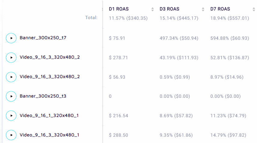 While this task is seemingly easy to complete, you want to consider not just the absolute number of installs (which obviously matters), the IPM, or the resulting eCPI, but the ROAS for each creative.