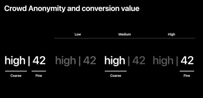 A hierarchical conversion value is dependent on the crowd anonymity threshold as well. Here, Apple introduces 2 variations: fine-grained (more detailed information expressed in a number, limited to up to 64 possible values), and coarse-grained (limited postback information expressed in a relative value) conversion values.